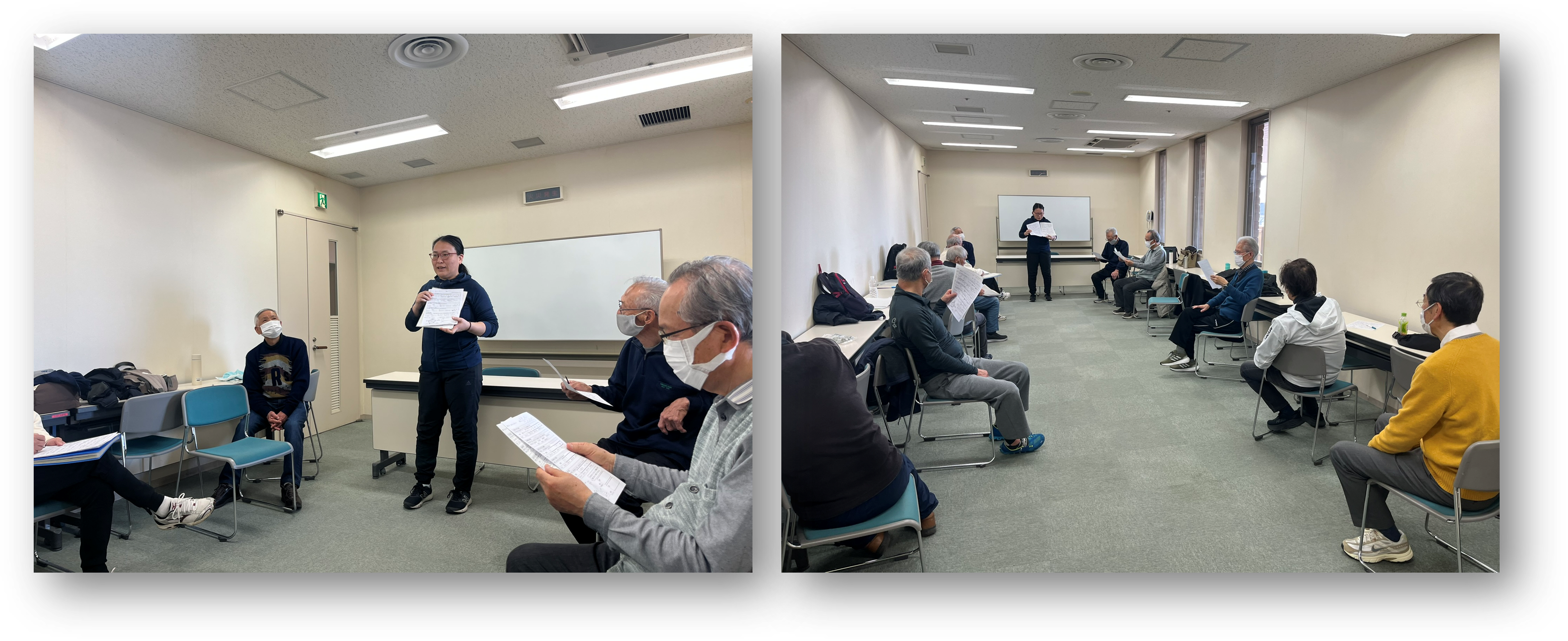 前橋市福祉会館2Fの子育て研修室にて、鈴木先生の指導によるエクササイズを行いました。主な内容として「体力チェックシート」に基づき、片足立ち、長座体前屈、座位ステッピングテスト、立ち上がりテスト、握力測定を行い、更にその結果をレーダーチャートに落とし込みました。これにより過去のデータと比較することにより、各項目毎の変化を知り、課題に取り組む事が大切との説明を受けました。その後の質疑応答も含め、有意義な時間を過ごす事が出来ました。